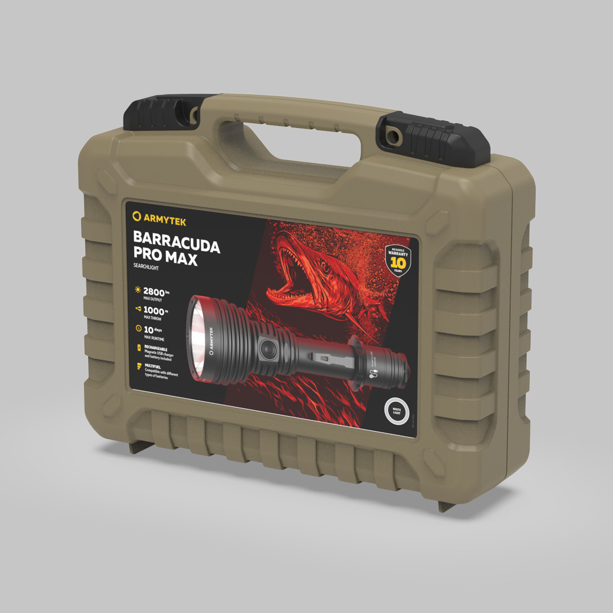 Флагман линейки поисковых фонарей Более 15 лет опыта разработок позволили нам создать самый потрясающий луч света для поискового фонаря, который значительно превосходит другие. Barracuda Pro Max — это фонарь с впечатляющей дальностью света в 1000 метров и яркостью в 2800 люмен. Модель предназначена для проведения поисковых операций: дальнобойный луч с четким центральным пятном высвечивает объекты, находящиеся на значительном расстоянии. Тщательно проработанная конструкция позволила добиться максимальной эргономичности: высокая яркость и дальность света обеспечиваются всего одним диодом, а значит фонарь не утяжеляется дополнительными рефлекторами и другими элементами оптической системы. Наличие двух кнопок управления обеспечивает быстрый доступ к необходимым режимам. Barracuda Pro Max работает не только на комплектном элементе питания, но и на любом стандартном аккумуляторе 21700 Li-Ion, а также, благодаря адаптеру, на аккумуляторе 18650 Li-Ion или на двух литиевых батарейках CR123A. Вариативность элементов питания позволяет значительно повысить автономность. Фонарь совместим с оригинальными выносными кнопками и подствольными креплениями и может быть использован в качестве тактического. BARRACUDA PRO MAX — ФОНАРЬ 2 В 1 Поисковый фонарь Большой глубокий рефлектор для максимальной дальнобойности Cовместимость с различными элементами питания для продолжительных поисковых операций Практичный пластиковый кейс Тактический фонарь Кнопка в задней крышке и комплектные аксессуары для комфортного использования в качестве ручного тактического фонаря Стандартное тело диаметром 1 дюйм и опциональные аксессуары для использования в качестве оружейного фонаря Возможности Barracuda Pro Max Обновленная оптическая система: диод High Intensity в сочетании с большим глубоким рефлектором в голове диаметром 64 мм обеспечивает дальность света в 1 километр. Детально проработанная конструкция головы: новая конструкция для лучшего теплоотвода. Обновленная электроника: продолжительное время работы при высокой яркости. Удобное управление: отдельная боковая кнопка с мягким нажатием для переключения режимов, тактическая кнопка для включения и выключения фонаря, а также для быстрого доступа к режиму Стробоскоп. Новая тактическая кнопка: бесшумная электронная кнопка исключает демаскировку на охоте или во время спецопераций, в 20 раз долговечнее механической. Быстрая магнитная зарядка: комплектный аккумулятор 21700 Li-Ion 5000 мАч заряжается за 2 ч 45 мин. Усовершенствованная активная защита от перегрева в режиме реального времени: обеспечивает безопасное и комфортное использование. При приближении температуры к +58 °C яркость снижается, что позволяет избежать перегрева фонаря и аккумулятора, а также деградации диода. Соответствует европейским требованиям безопасности. Улучшенные пружины: использование новых пружин для лучшей защиты аккумулятора и драйвера и увеличения эффективности работы. Стальной безель: дополнительная защита оптической системы. Совместимость с элементами питания различных типоразмеров: фонарь работает на одном стандартном аккумуляторе 21700 Li-Ion или 18650 Li-Ion, а также на двух литиевых батареях CR123A. Готовое к использованию решение: аккумулятор высокой емкости 21700 Li-Ion 5000 мАч, адаптер для использования аккумуляторов 18650 Li-Ion или батарей CR123A, быстрая магнитная USB-зарядка 
